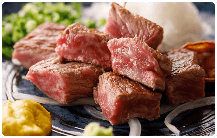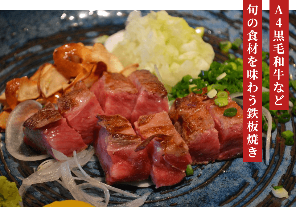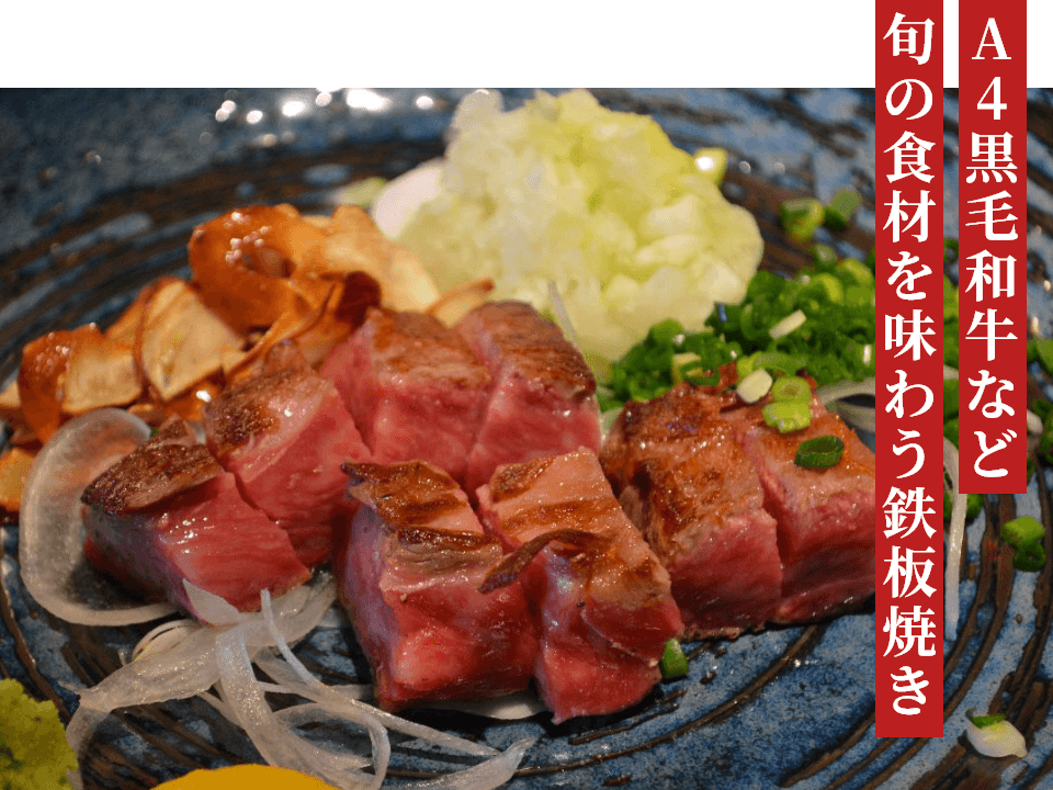 名物の黒毛和牛サーロインステーキをはじめ、白いか焼き・三陸牡蠣・霧島地鶏など、季節替わりの逸品をご提供しています。
