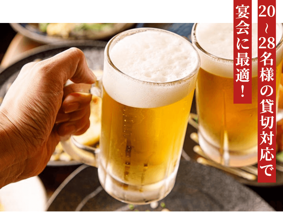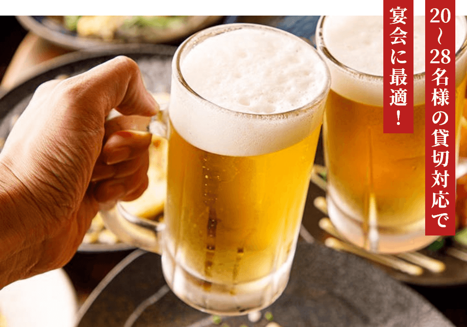 店内貸切は20名様から最大28名様まで対応可能。企業宴会・忘新年会・歓送迎会・仲間内の集まりなど、大人数でのご利用も大歓迎です。