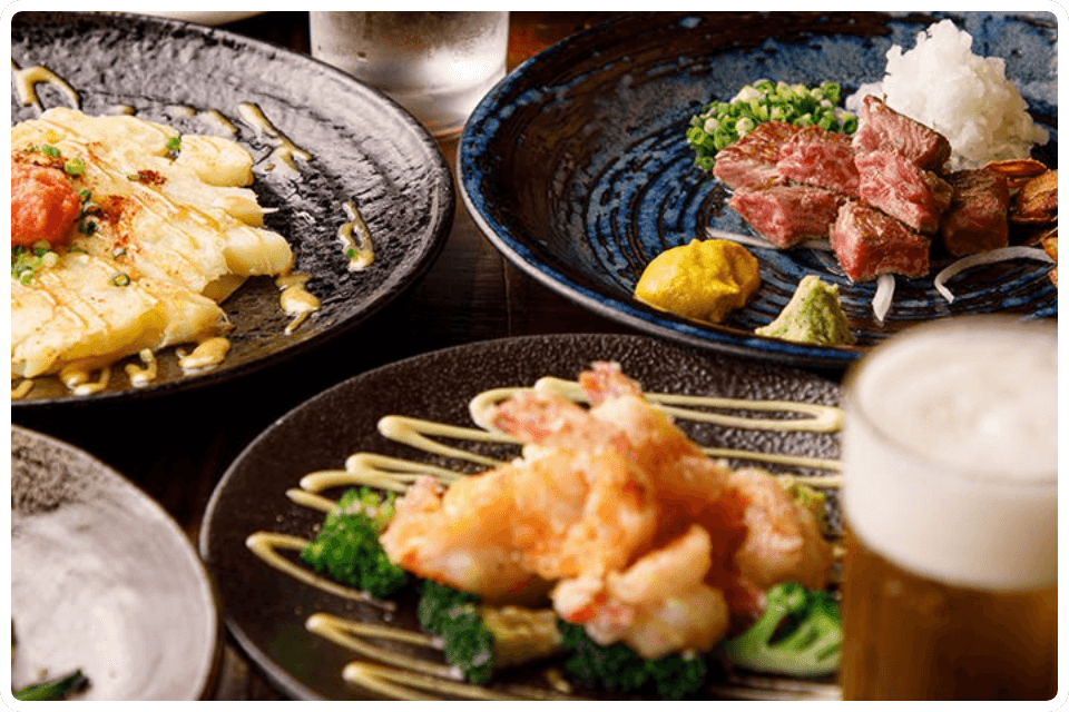 季節の鉄板焼きから、人気の海鮮・黒毛和牛ステーキ・ミックスお好み焼きまで、バラエティ豊かな料理を一度に楽しめる満足度の高いコースです。